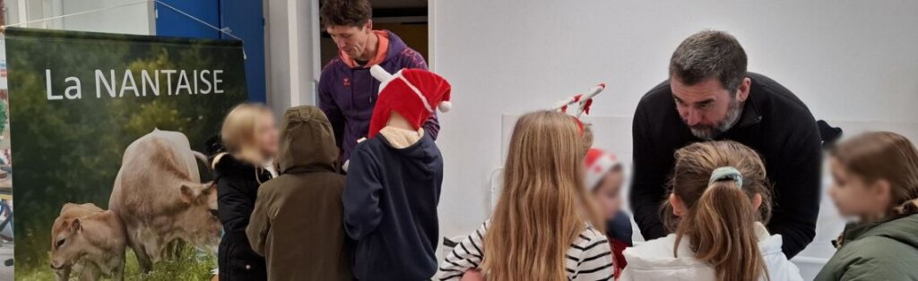 Deux éleveurs, Grégoire Minday et Alexis Férard, aidés d’Olivier Paressant de l’Etable nantaise et de Pierrick Boireau pour la filière, ont proposé sur les 2 sites de restauration, une animation avant repas auprès des jeunes convives, afin d’expliquer la race nantaise, le produit qu’ils allaient manger, d’où les veaux provenaient et comment ils avaient été élevés.